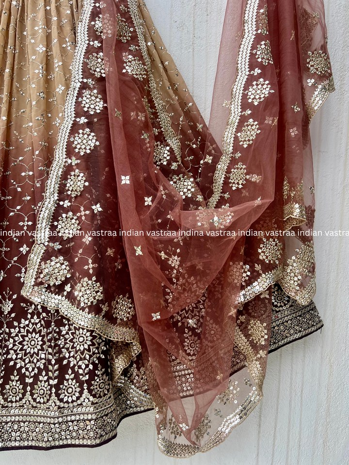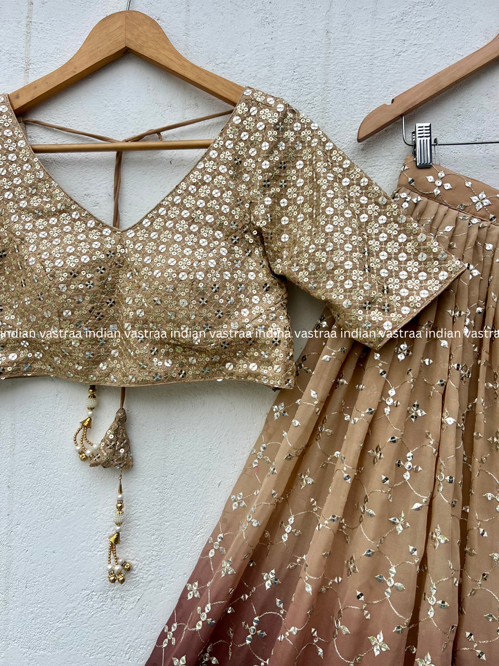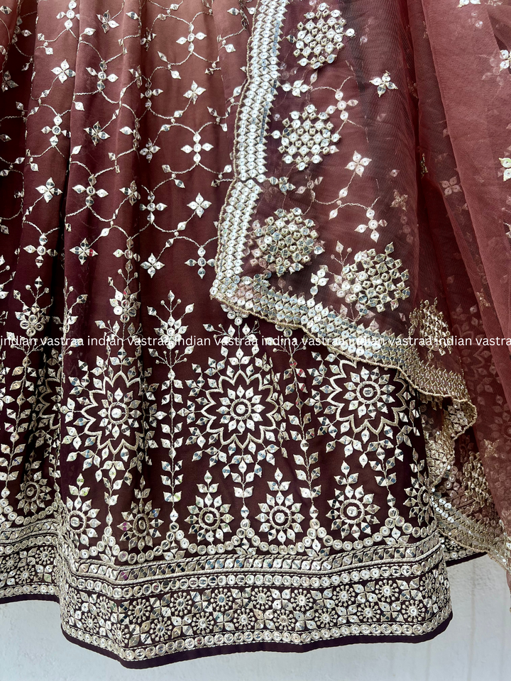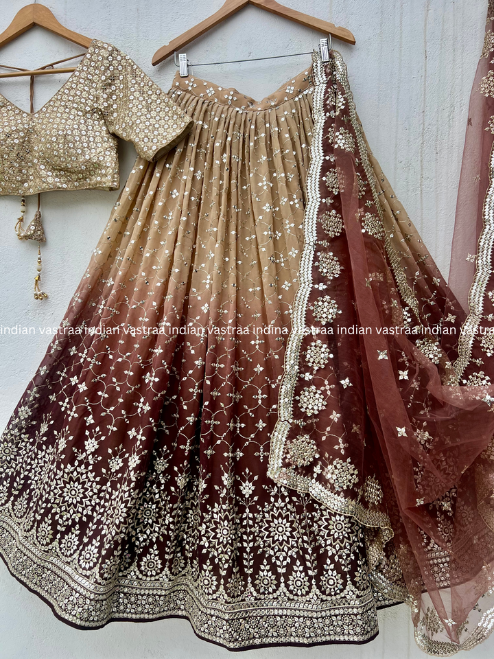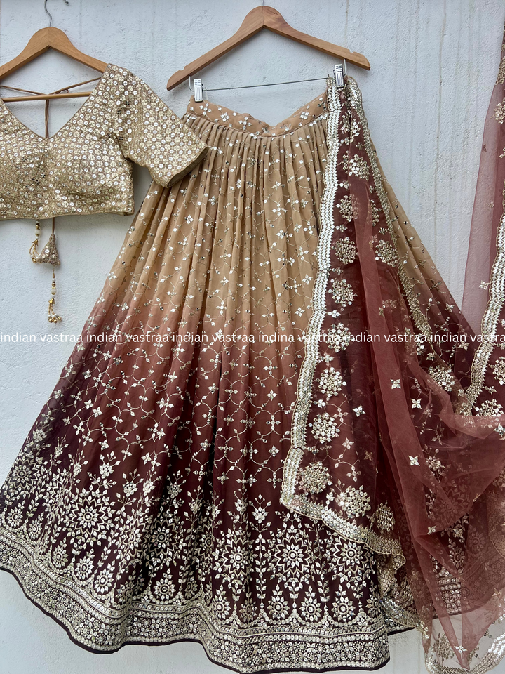 Make a bold and elegant impression in this Brown Ombre Georgette Lehenga Choli, Perfect for Indian weddings, festive celebrations, and special occasions. Crafted in premium quality georgette, this ensemble features a stunning ombre fade from deep brown to lighter hues, with detailed embroidery and sequin work throughout.
