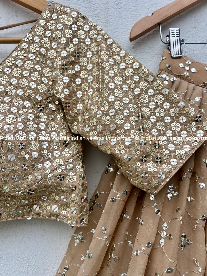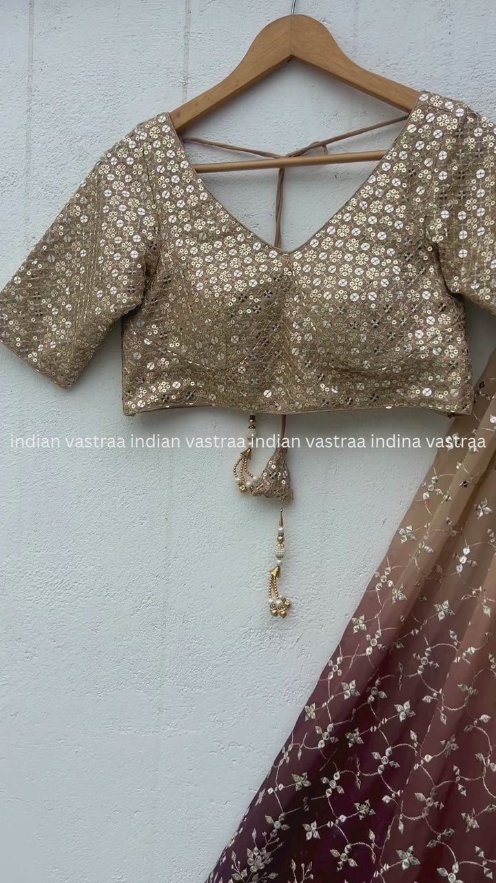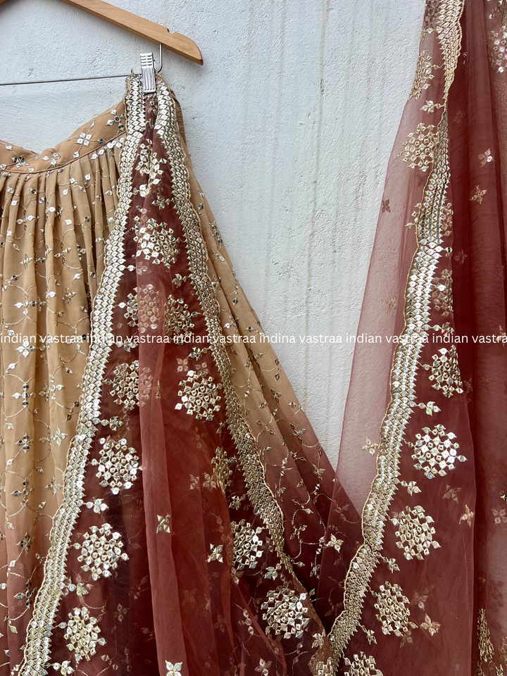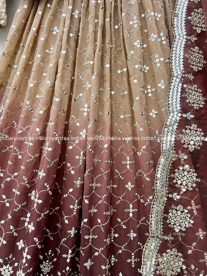 Make a bold and elegant impression in this Brown Ombre Georgette Lehenga Choli, Perfect for Indian weddings, festive celebrations, and special occasions. Crafted in premium quality georgette, this ensemble features a stunning ombre fade from deep brown to lighter hues, with detailed embroidery and sequin work throughout.