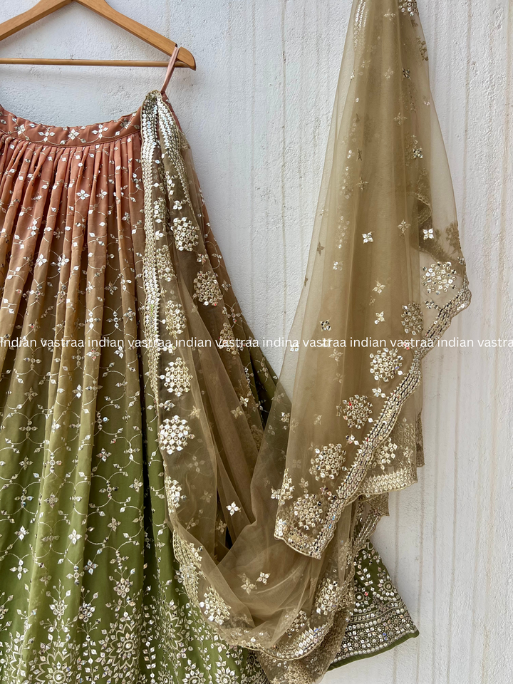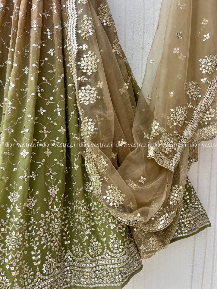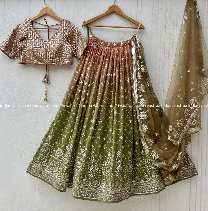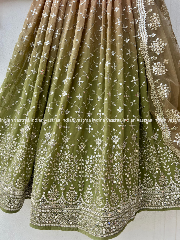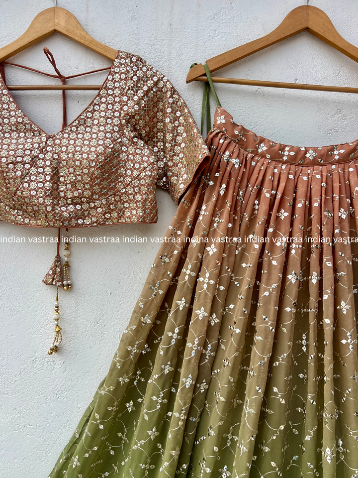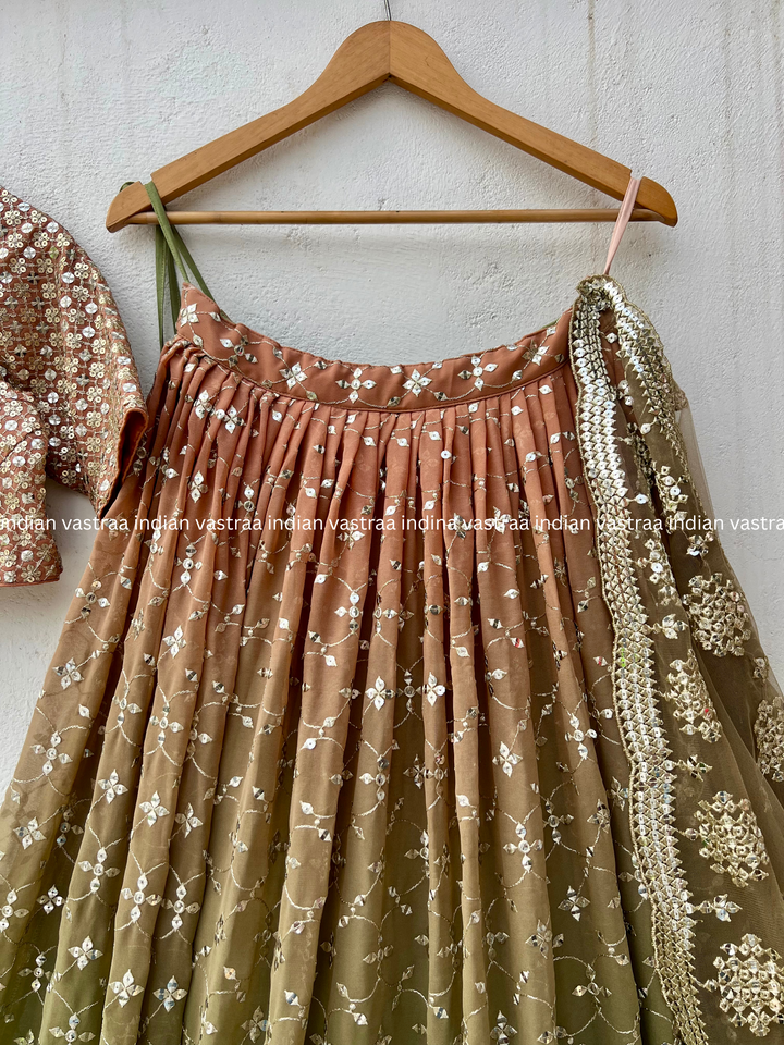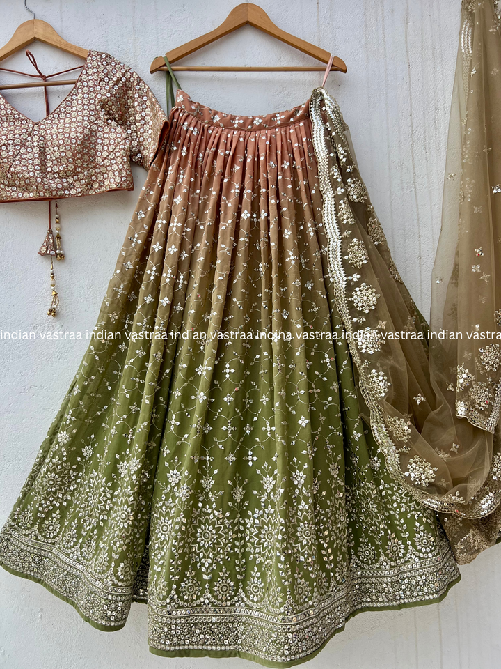 Make a bold and elegant impression in this Mehendi Ombre Georgette Lehenga Choli, Perfect for Indian weddings, festive celebrations, and special occasions. Crafted in premium quality georgette, this ensemble features a stunning ombre fade from deep brown to lighter hues, with detailed embroidery and sequin work throughout.