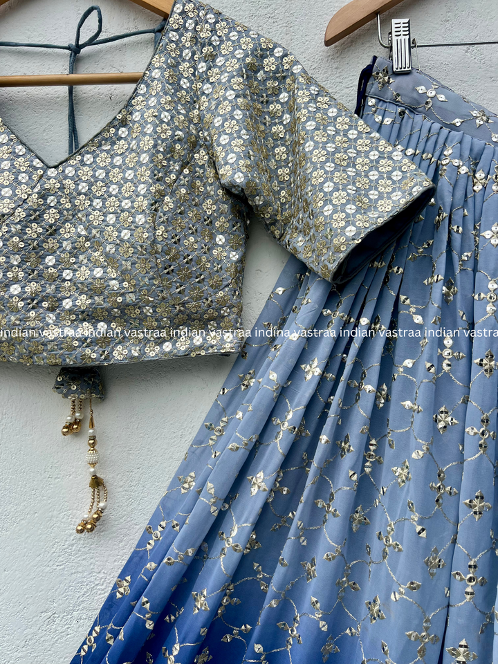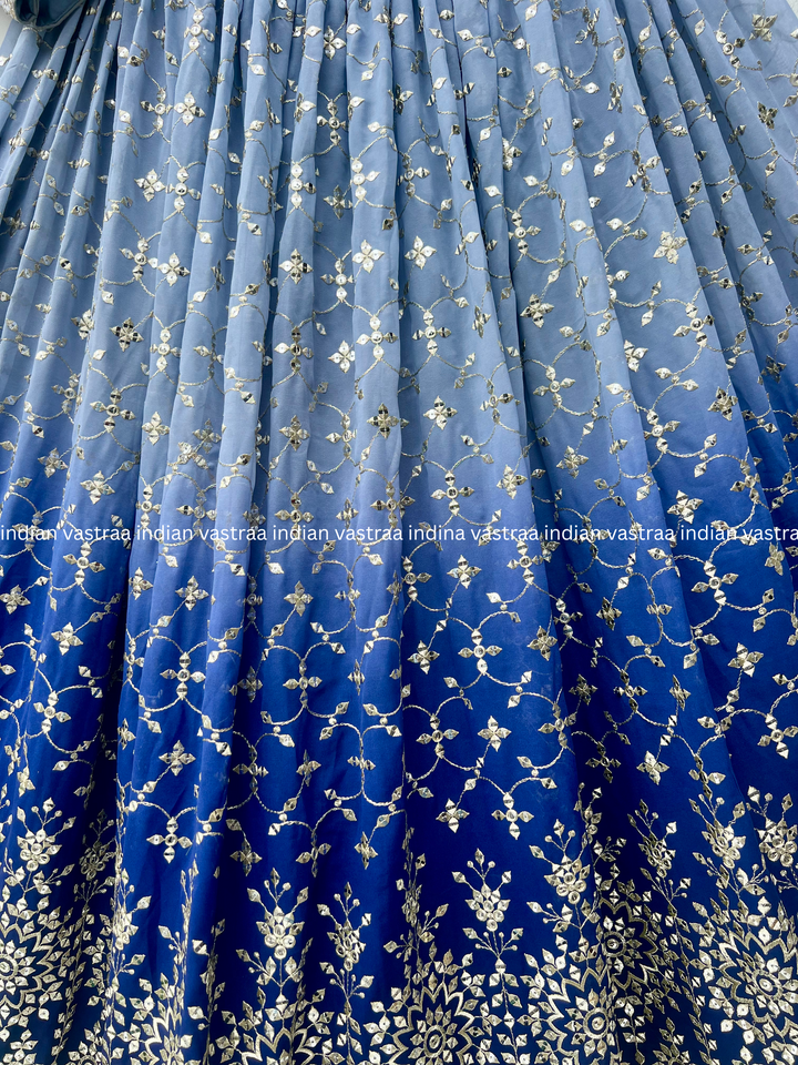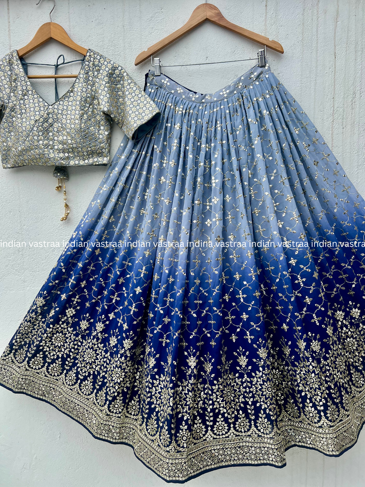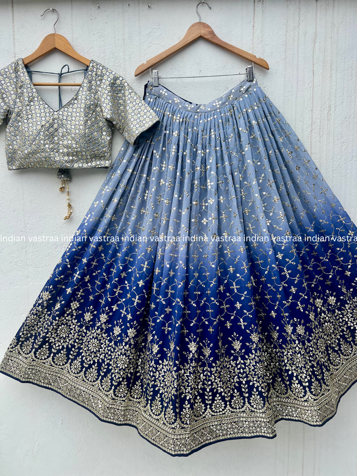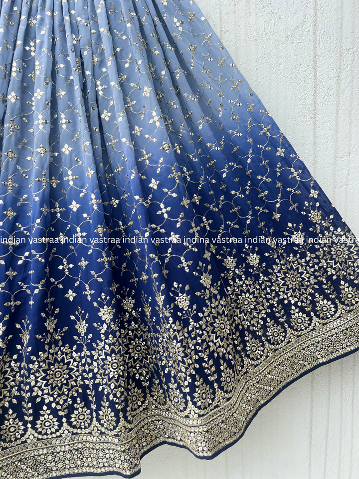 Make a bold and elegant impression in this Navy Blue Ombre Georgette Lehenga Choli, Perfect for Indian weddings, festive celebrations, and special occasions. Crafted in premium quality georgette, this ensemble features a stunning ombre fade from deep brown to lighter hues, with detailed embroidery and sequin work throughout.