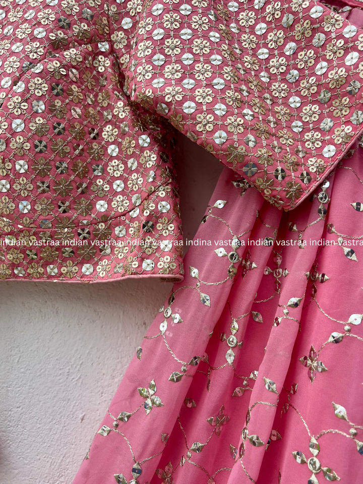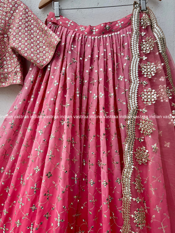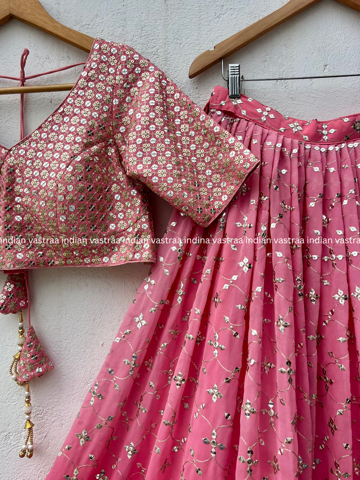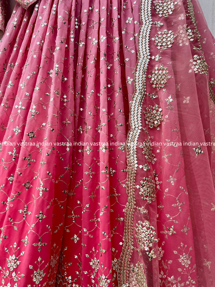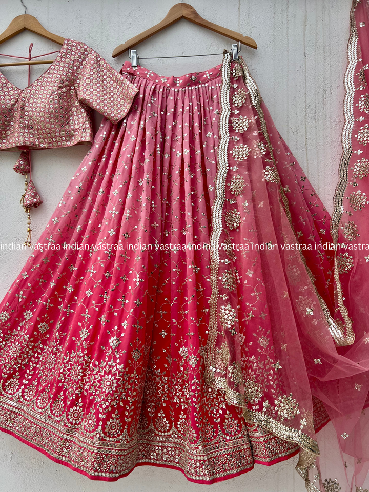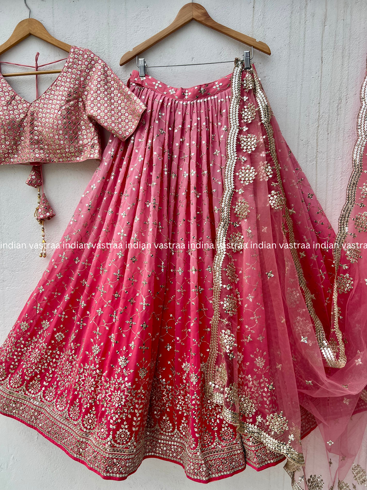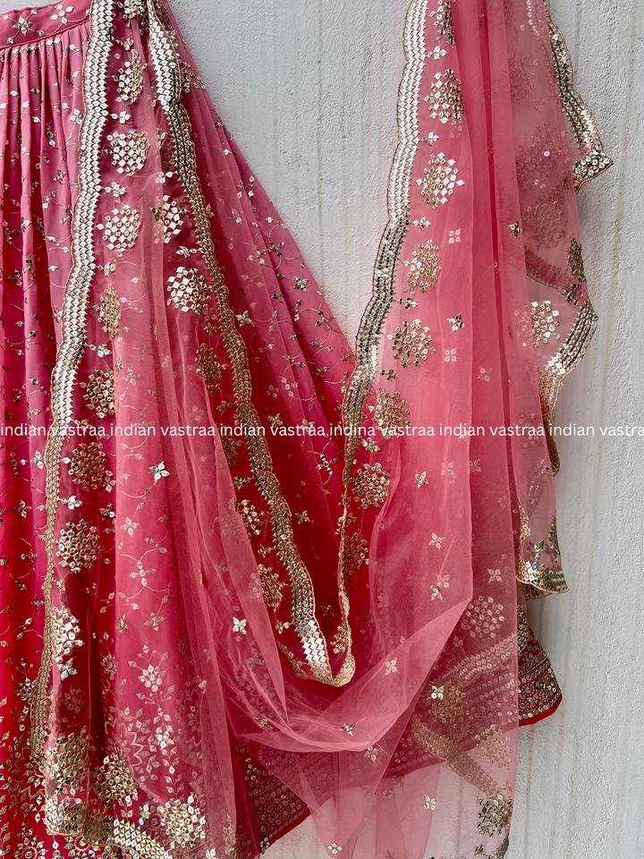 Make a bold and elegant impression in this Red Pink Ombre Georgette Lehenga Choli, Perfect for Indian weddings, festive celebrations, and special occasions. Crafted in premium quality georgette, this ensemble features a stunning ombre fade from deep brown to lighter hues, with detailed embroidery and sequin work throughout.