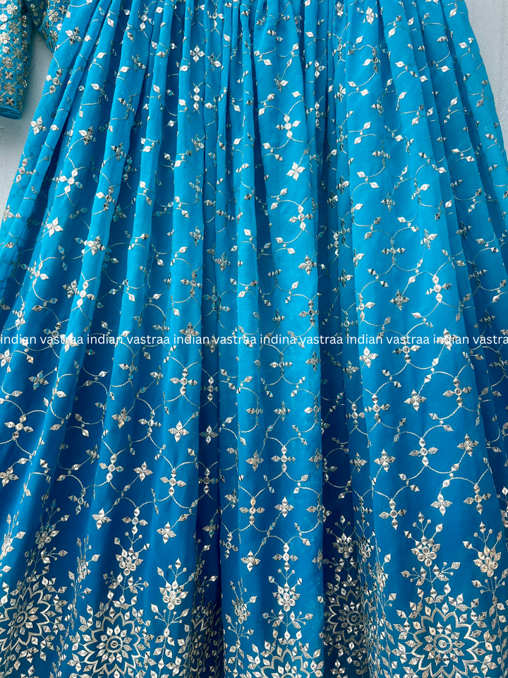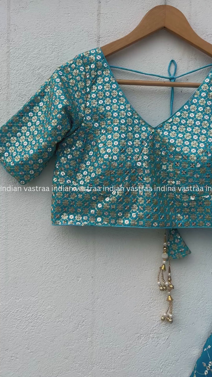 Make a bold and elegant impression in this Teal Blue Ombre Georgette Lehenga Choli, Perfect for Indian weddings, festive celebrations, and special occasions. Crafted in premium quality georgette, this ensemble features a stunning ombre fade from deep brown to lighter hues, with detailed embroidery and sequin work throughout.